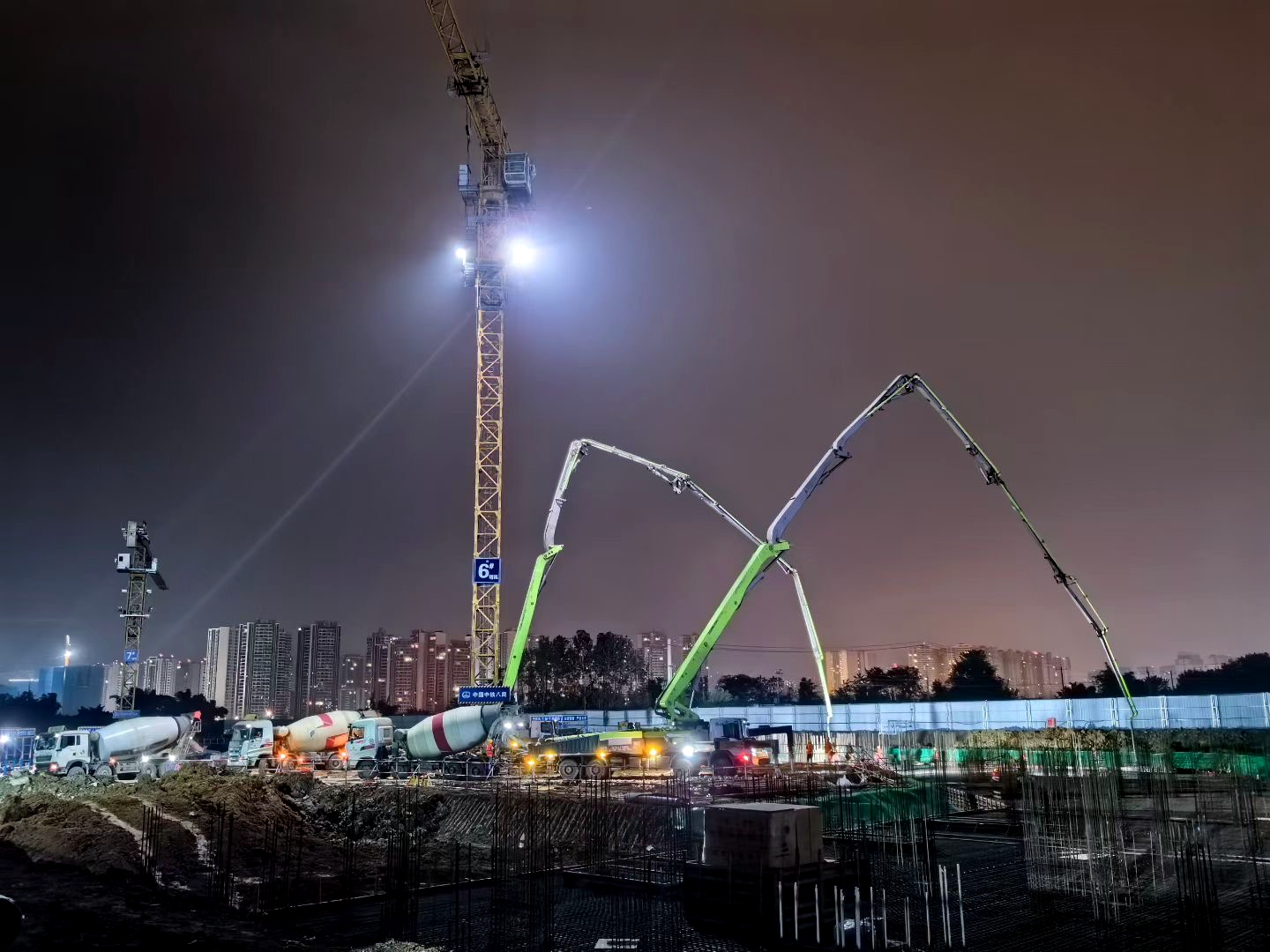本次浇筑的宿舍D区筏板面积2030平方米,设计混凝土用量约1600立方米。为确保混凝土浇筑任务顺利完成,项目部提前统筹、高效配置资源,投入2台64米泵车和14台罐车,循环运输,实现了混凝土连续供应,避免了冷缝产生,确保了施工质量。现场浇筑过程中,项目部安排物机部人员到商混站驻场,技术人员现场全过程盯控,保证了混凝土浇筑质量。此外,在正式浇筑前,项目部还组织监理及相关负责人进行技术方案交底,并计算浇筑时间,不仅减少了对周边居民的影响,还实现了运输安全。