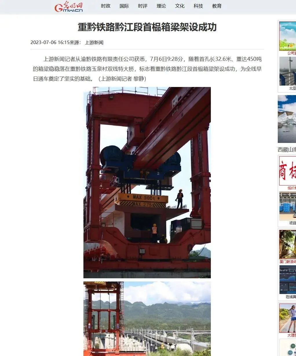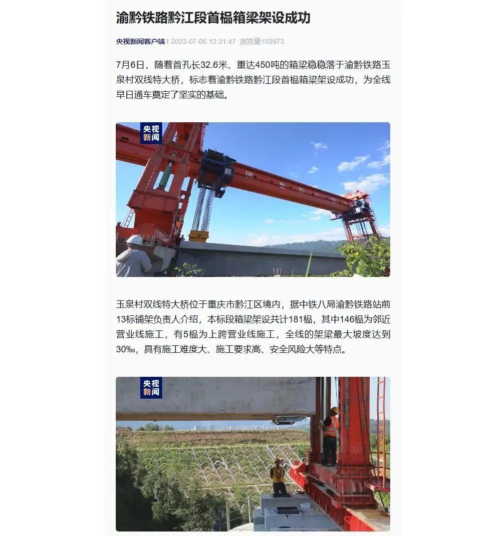 7月6日9时28分,随着首孔长32.6米、重达450吨的箱梁稳稳落在渝黔铁路玉泉村双线特大桥,由中铁八局参建的渝黔铁路黔江段首榀箱梁架设成功,为全线早日通车奠定了坚实的基础。